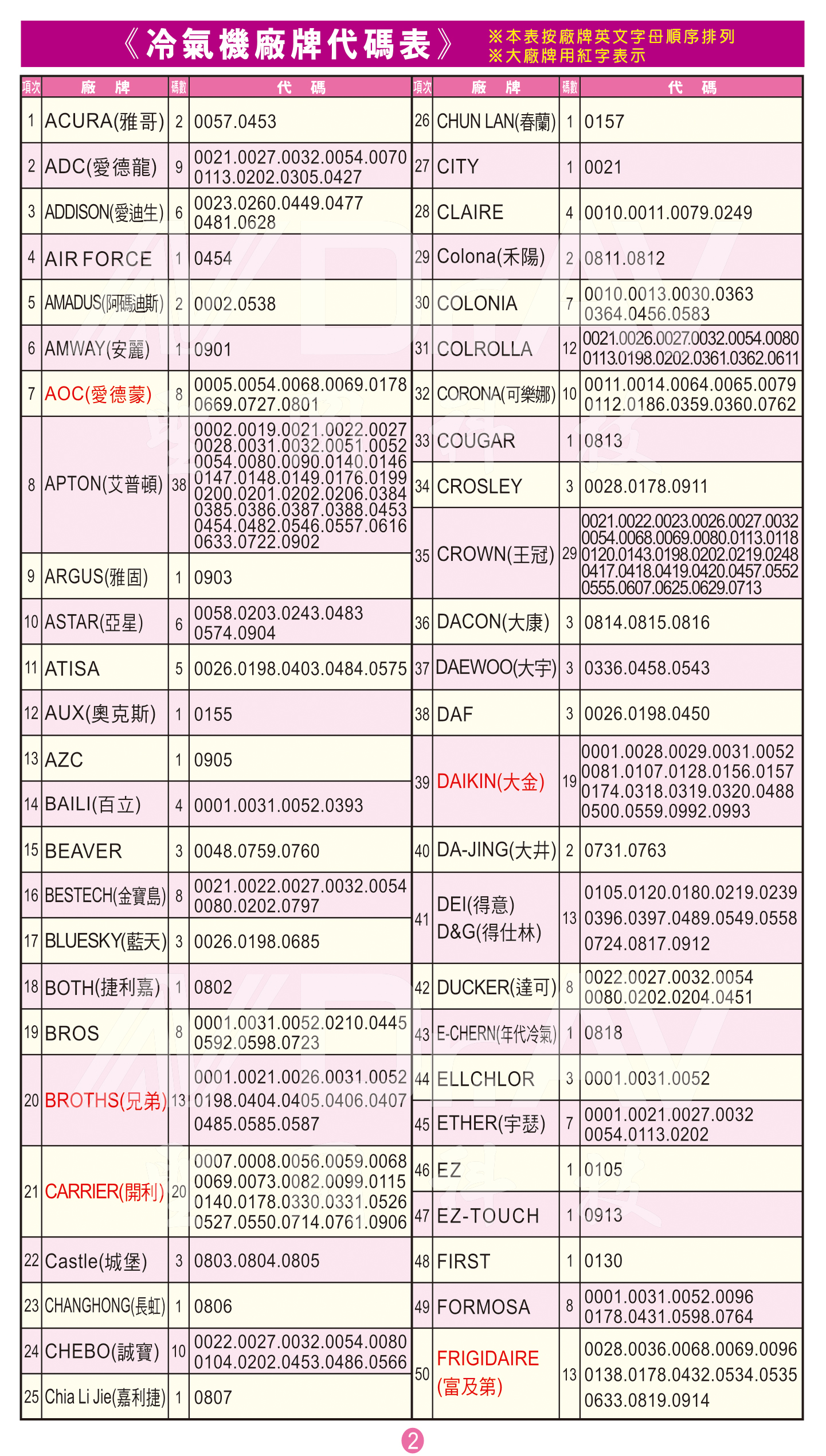 大金:代碼及命令詞查詢
