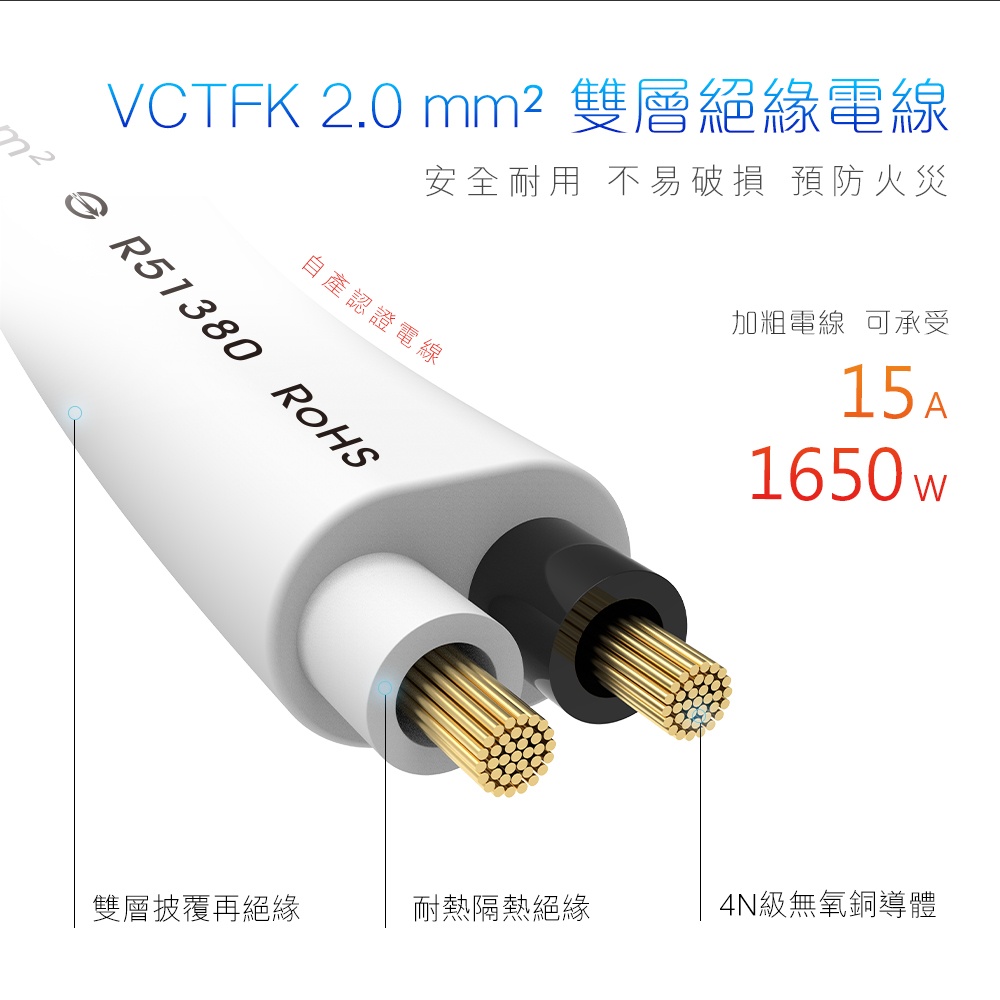 ●雙層絕緣加粗電線可承受15A 5433瓦