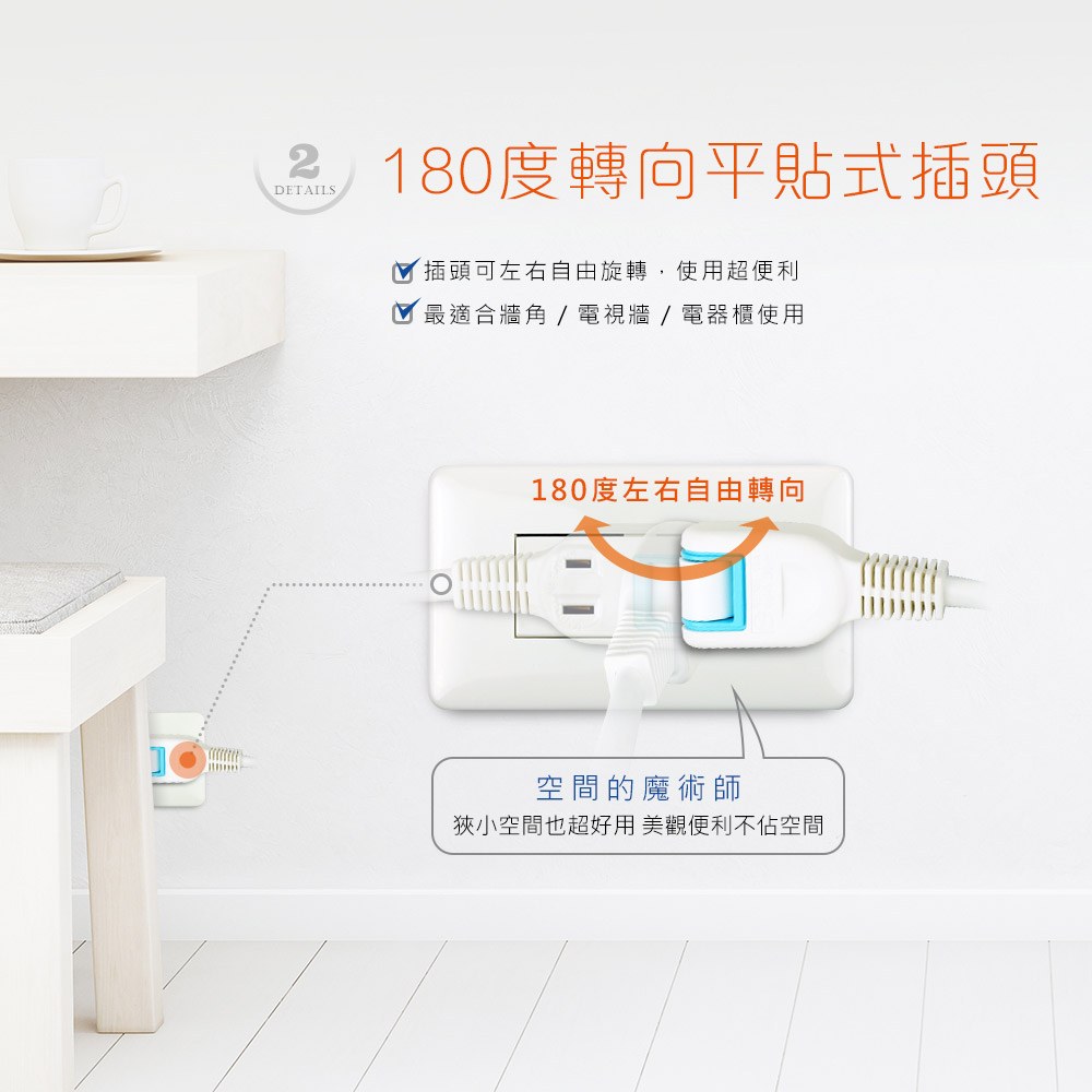 ●57度平貼式左右旋轉插頭使用不佔空間