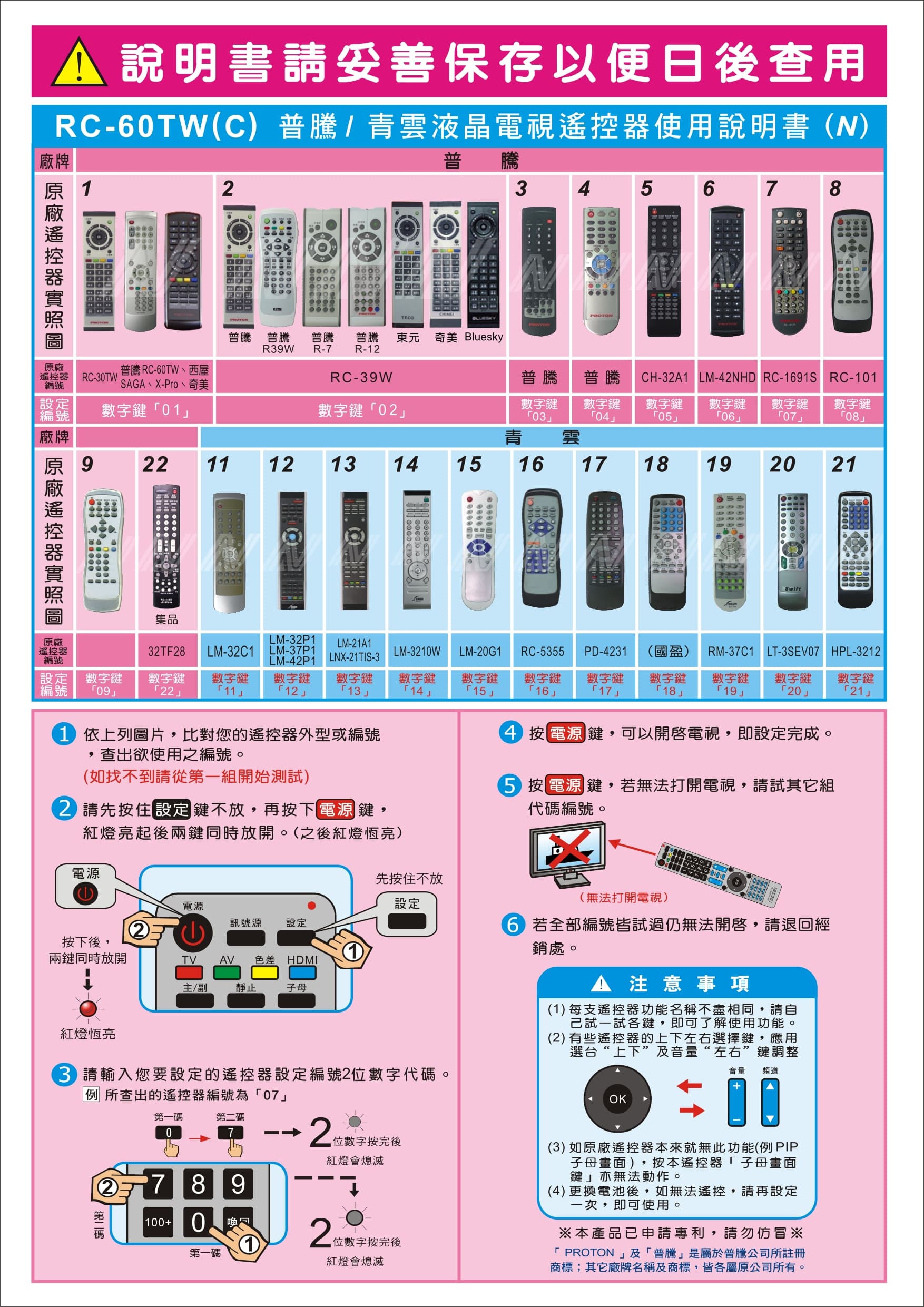 RC-7TW 普騰/青雲液晶電視遙控器