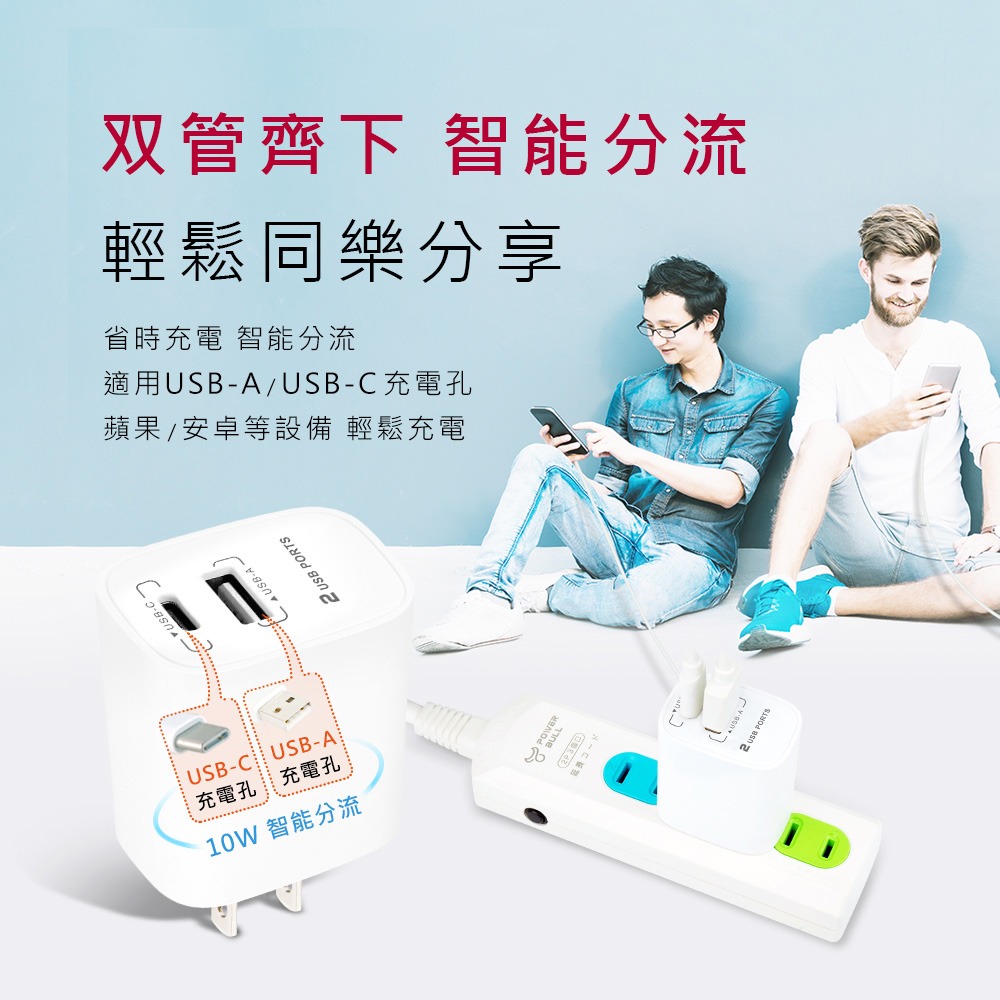 ●2孔同時輸出,智能分配 USB A+C 10.5 W