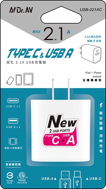 USB-221AC TYPE C & USB A 双孔2.1A USB充電器