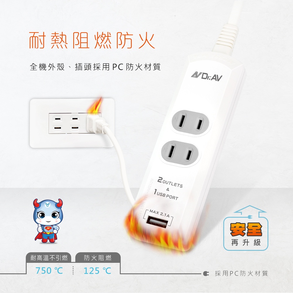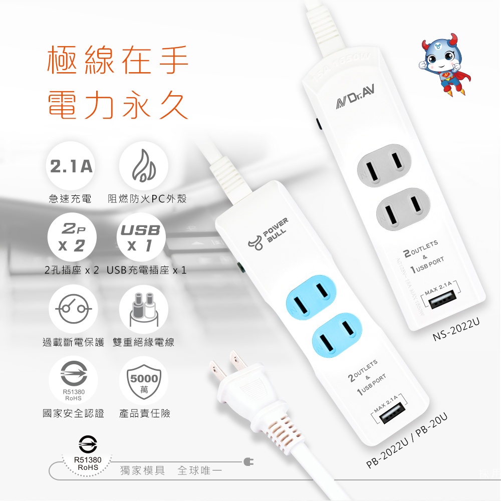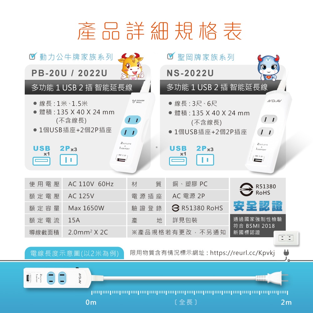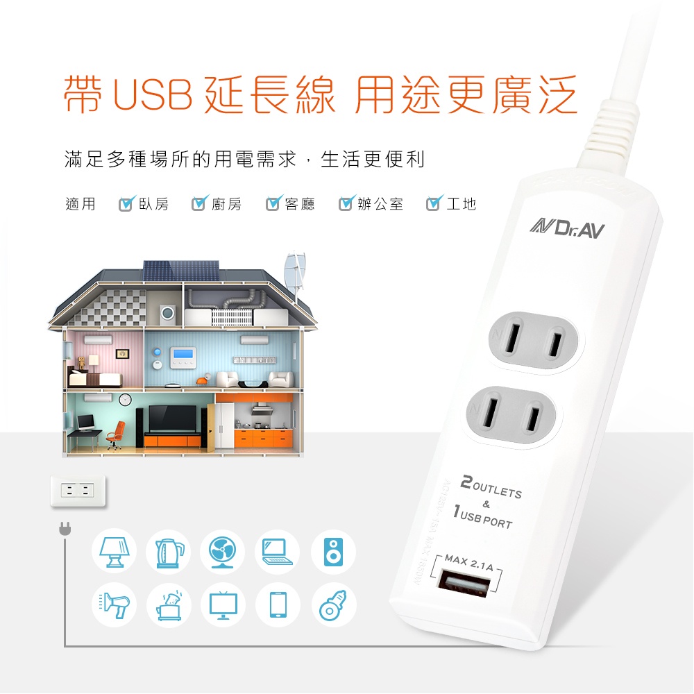 PB-20U多功能1USB 2插2P延長線(1/1.5米/2.1A)