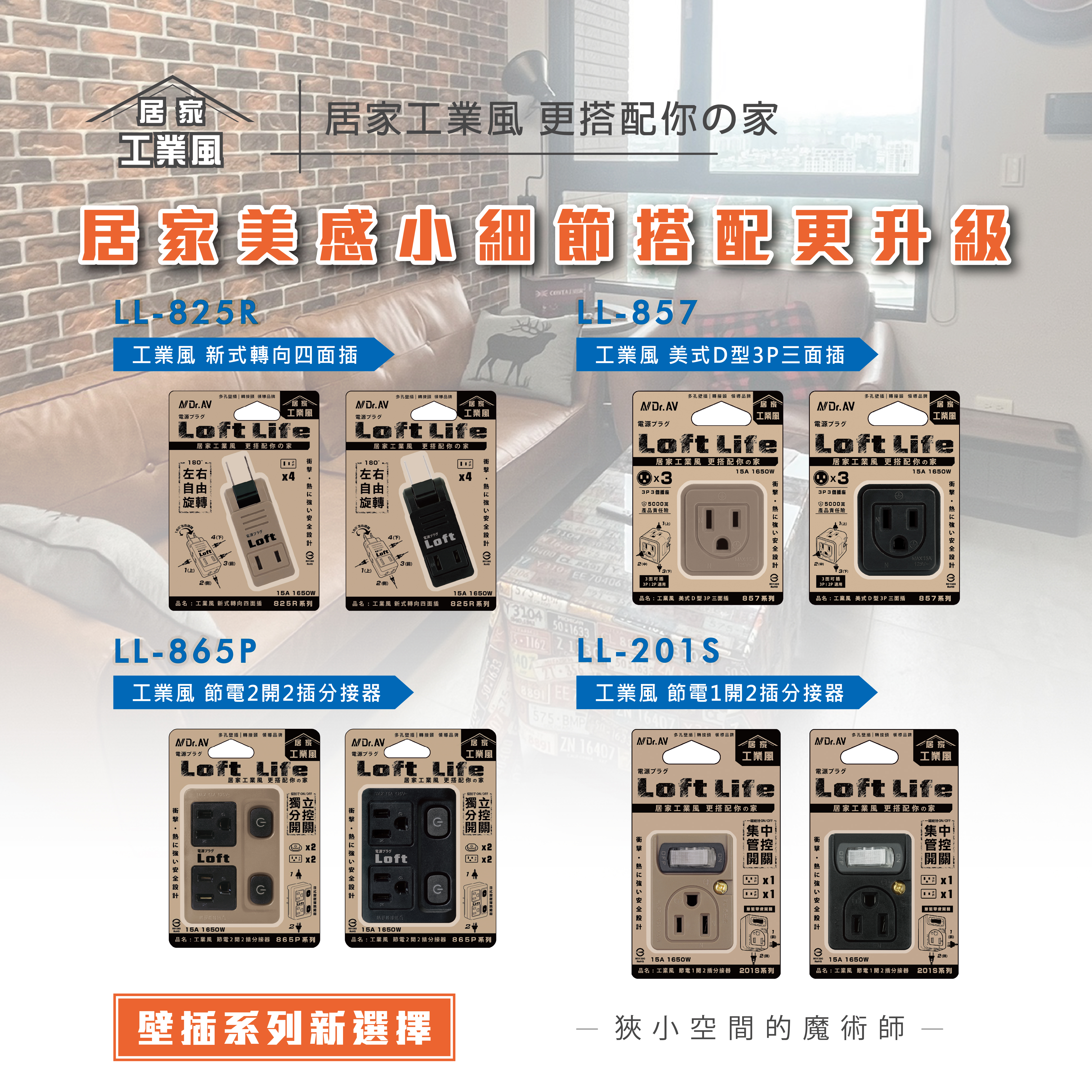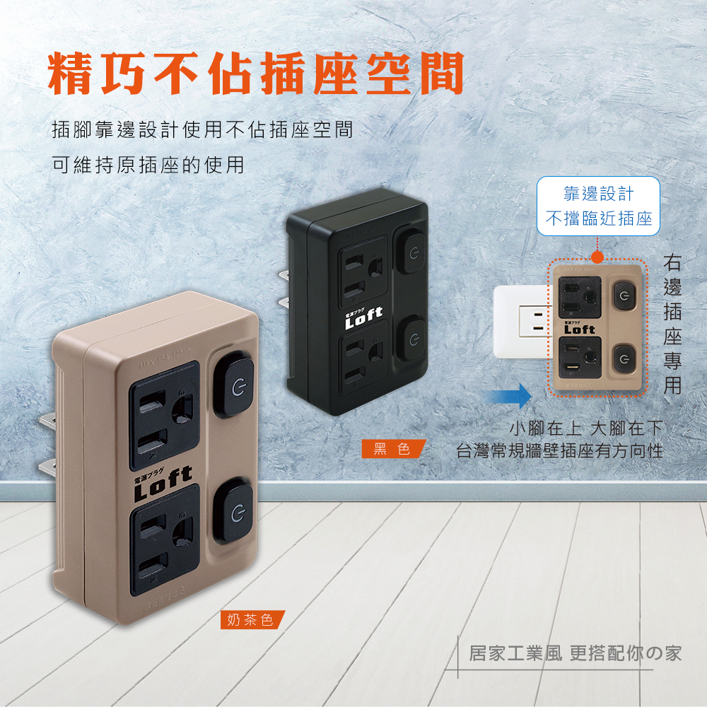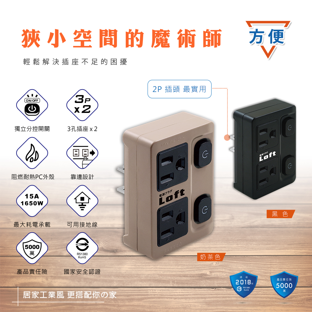 LL-731-6(奶茶色/黑色) 工業風1切6插橫向3P延長線/6尺