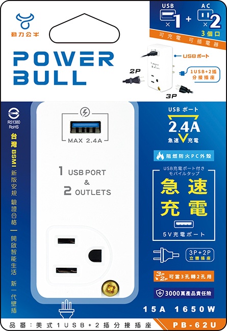 PB-63U 2USB+2插節能分接插座
